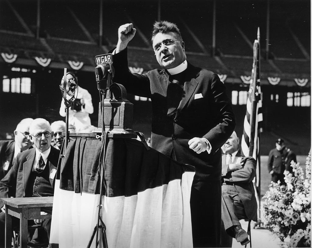 Fr. Charles Coughlin was a Catholic priest born in Canada who became a U.S. citizen. He was an antisemitic, anti-Communist, pro-Nazi, outraged radio host whose audience was the largest in American history (29 million listeners out of 130 million Americans). His newspaper, Social Justice, had a circulation of 200,000 in 1940. He had his own paramilitary, the Christian Front militia (“Fr. Coughlin’s Brownshirts”), that was organized like a terrorist cell. In Boston, they showed Nazi military propaganda films. Like the Oath Keepers today, they recruited from military and police for weapons and credibility. His followers were poor and working class Irish and Germans from Northeast and Midwest. His National Union for Social Justice was a political movement focused on replacing capitalist democracy. He published the fraudulent, Russian-invented antisemitic conspiracy fantasy, The Protocols of the Elders of Zion; Nazi propaganda; Goebbels’ speeches; and praised was praised by Der Stürmer. He verbally attacked refugees as communists and Jews and ranted about the “left-wing” “liberal” media. He worked closely with the German-American Bund. His rallies were replete with American flags and crowds riled up by hatred.