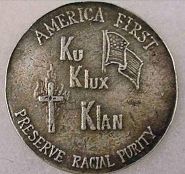 Below: 1920s KKK commemorative coin connects "America First" with white racial purity.